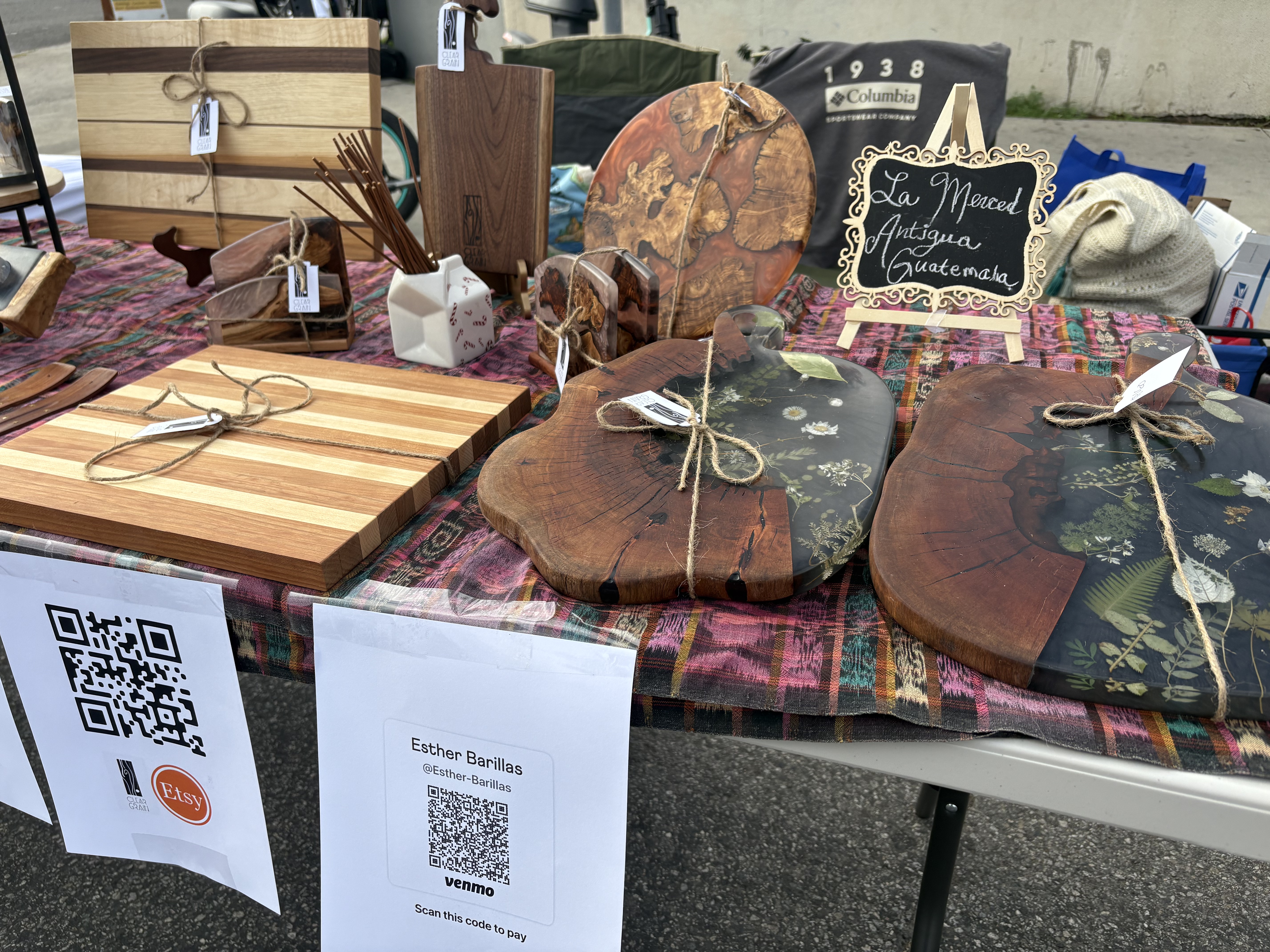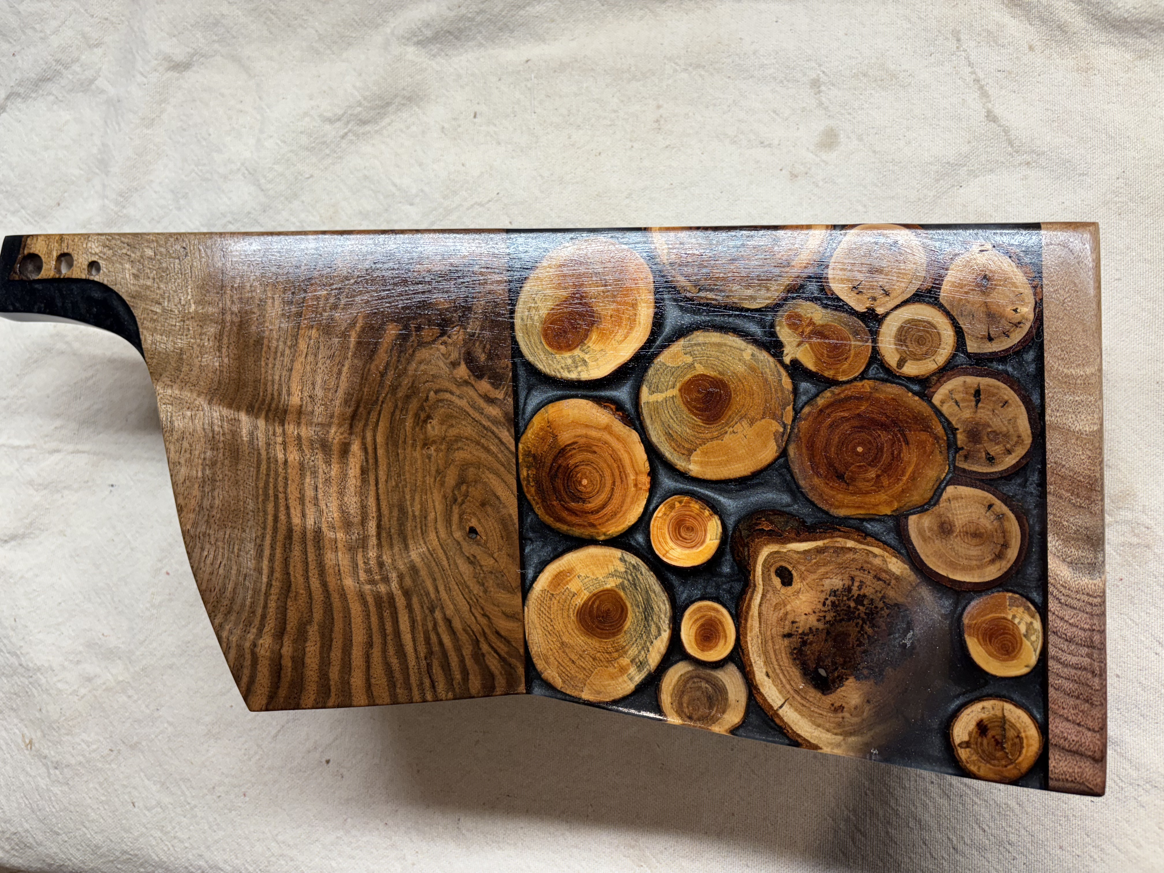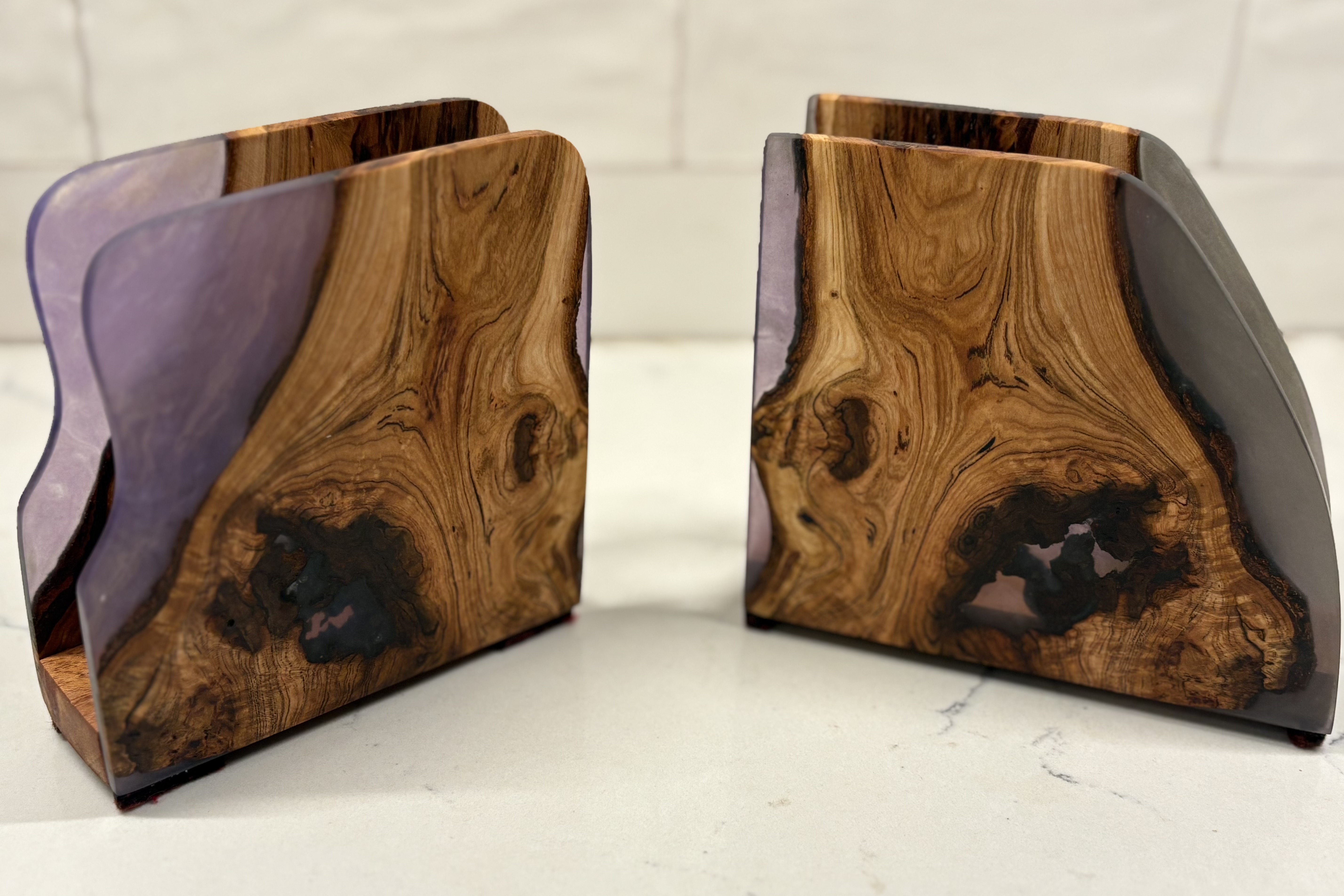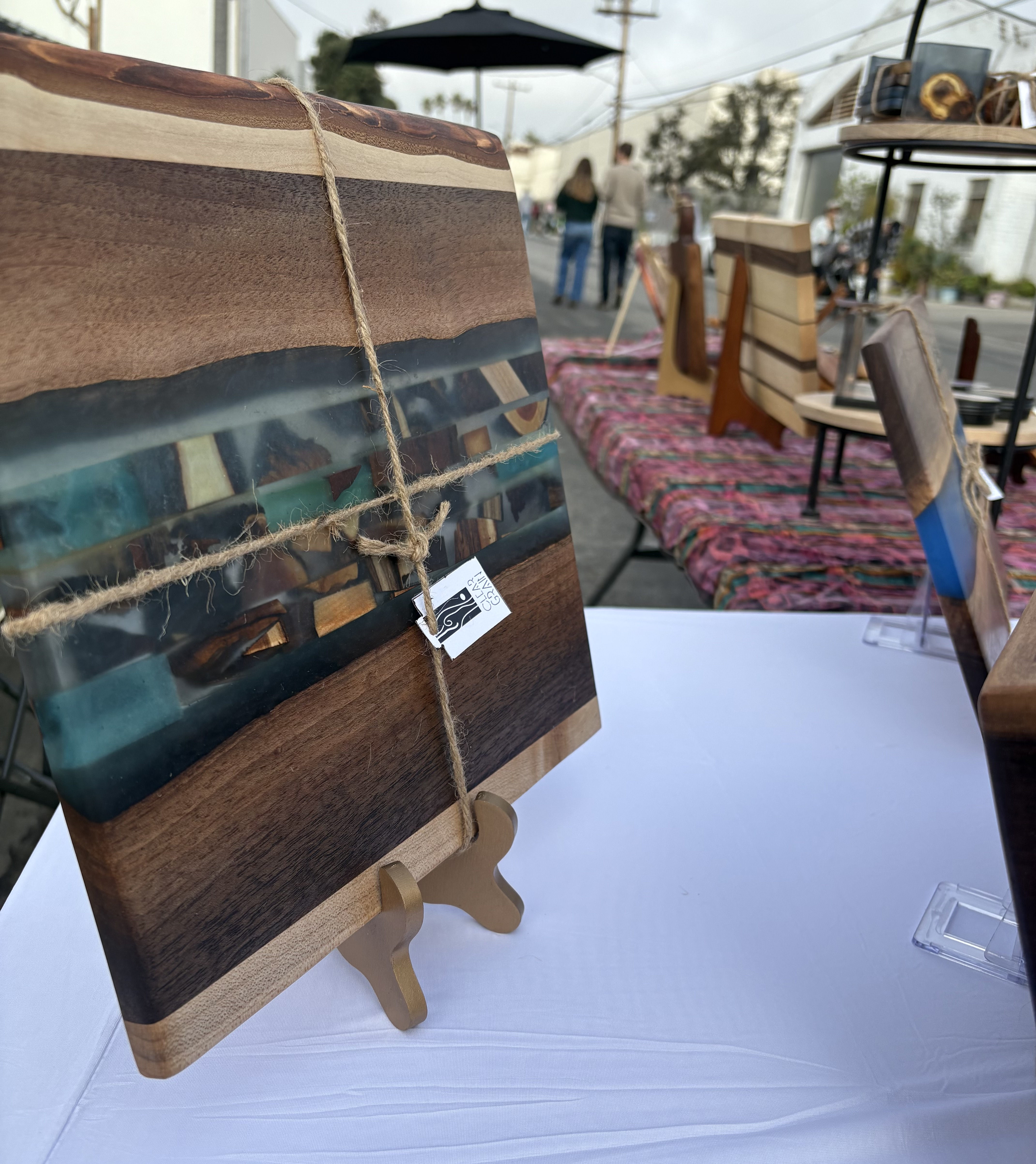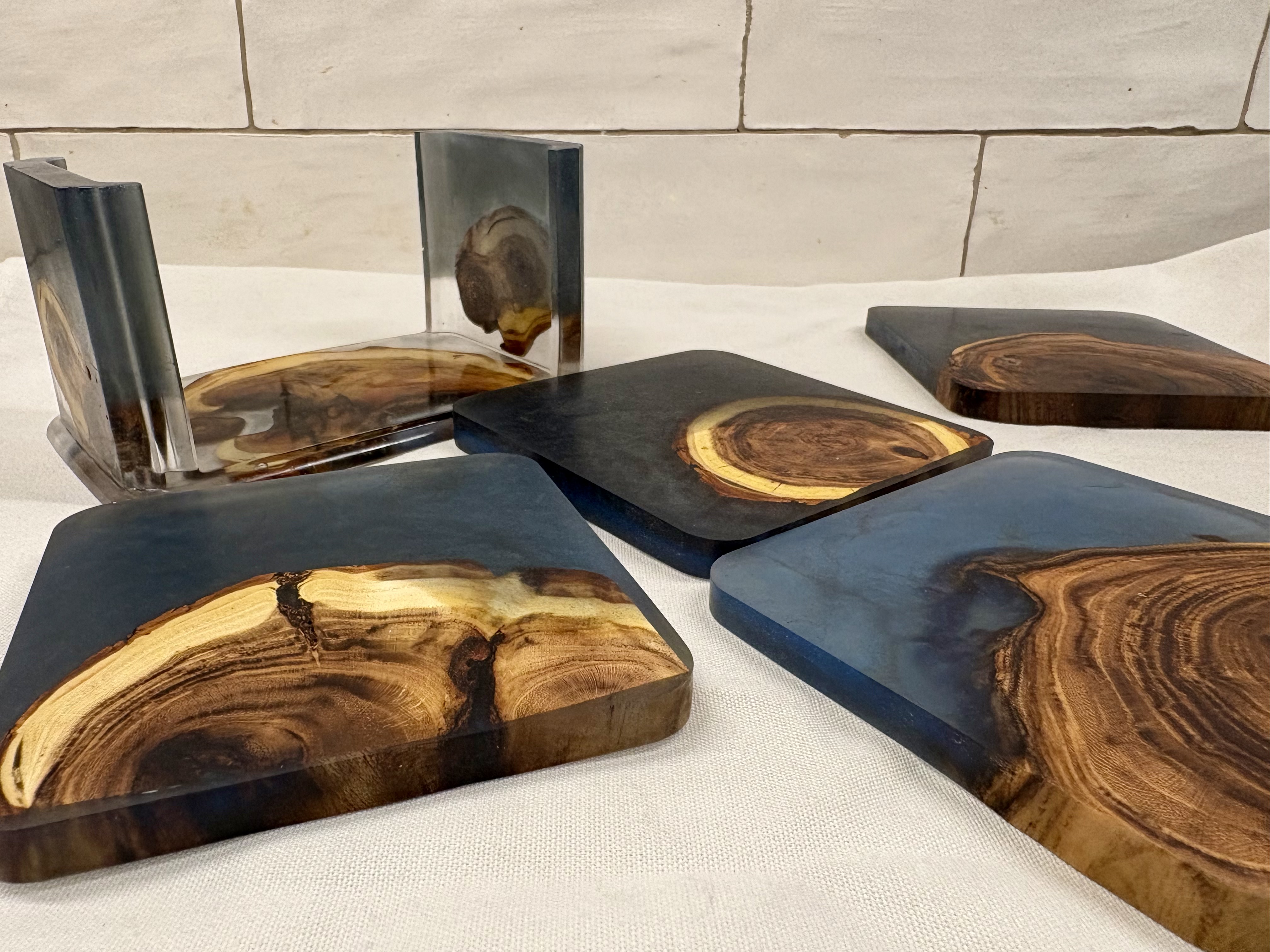 Apart from charcuterie boards, I also create napkin holders, trays, coasters, vases, cheese cutting boards and other similar items. I apply only food-safe oils or finishes to protect the wood and resin and bring out the natural beauty in each product. While I'm not the most experienced with my woodworking skills (yet), I take a more Artistic design approach to each project, having more of an art background. I choose color combinations and compositions that enhance the natural grain and form of the wood, while ensuring versatility and function.