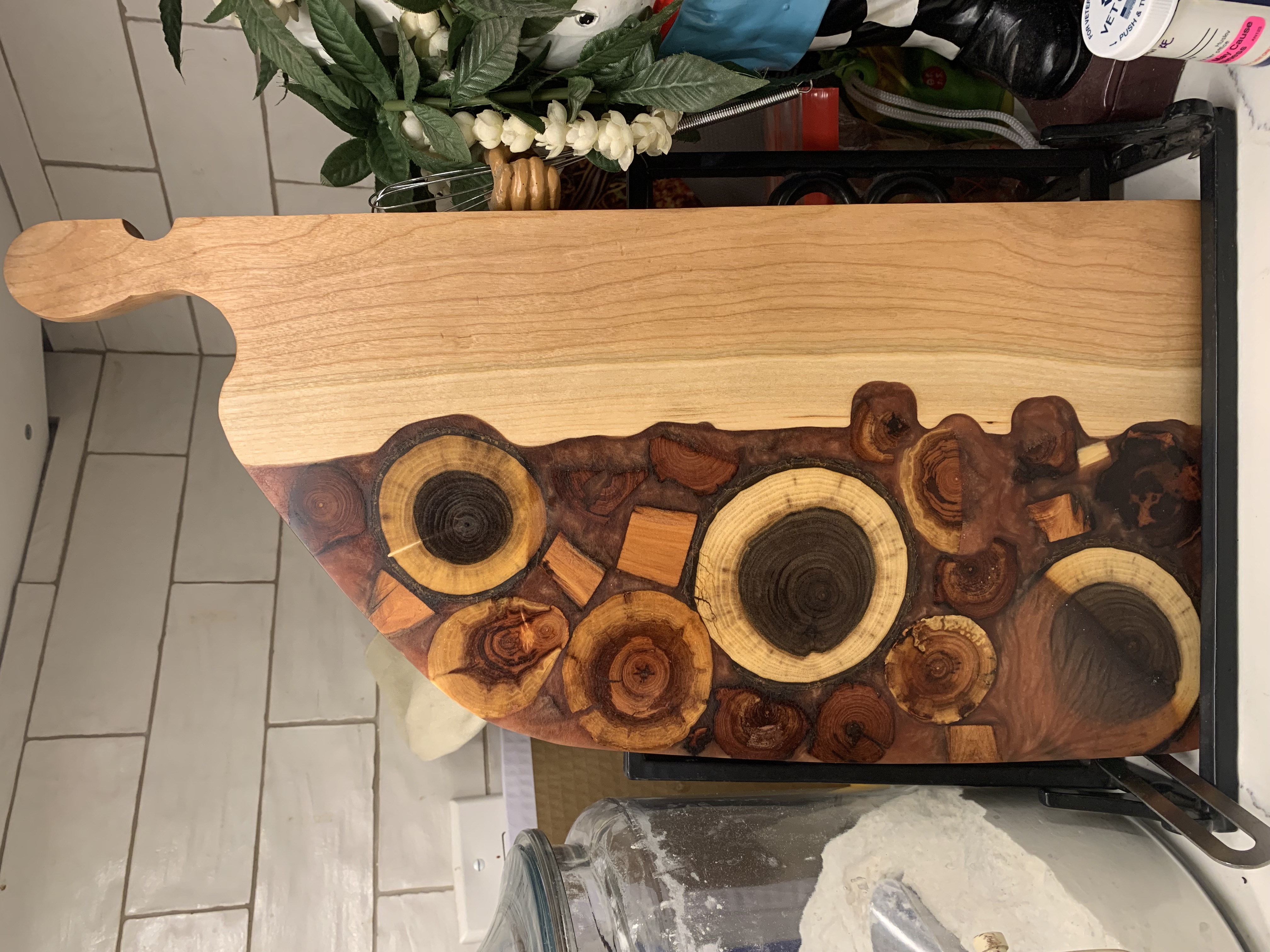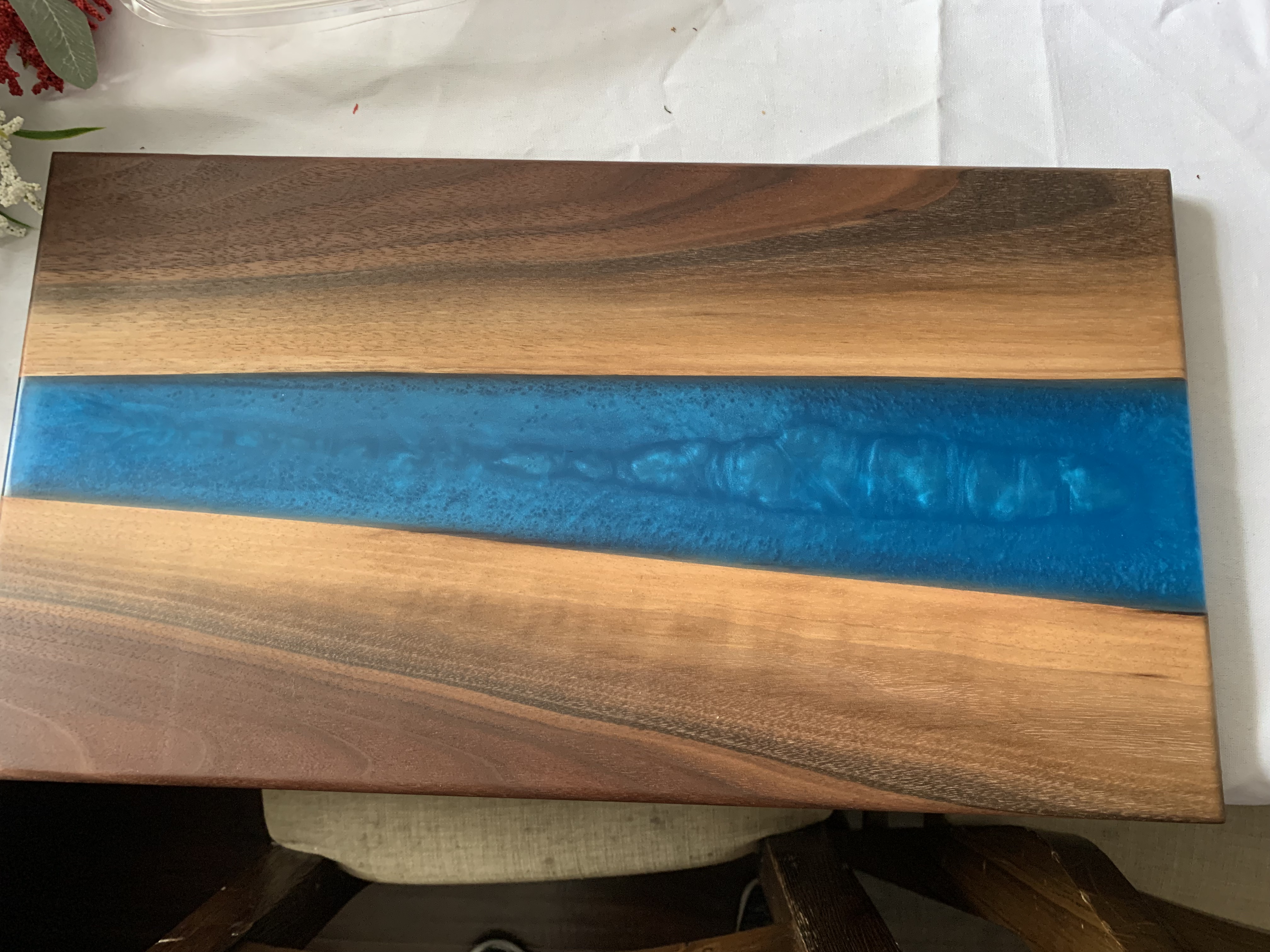 I'm an artisan who crafts beautiful, functional serving boards by combining natural wood with colored or clear epoxy resin. I blend traditional woodworking with contemporary resin art to create one-of-a-kind pieces that are both practical kitchen tools and striking decorative objects. From selecting hardwoods like maple, walnut, cherry, oak, or live-edge slabs for strength, grain beauty, and durability, to planning how the wood and epoxy will interact, to blending and setting and finally planing, sanding, and oiling.